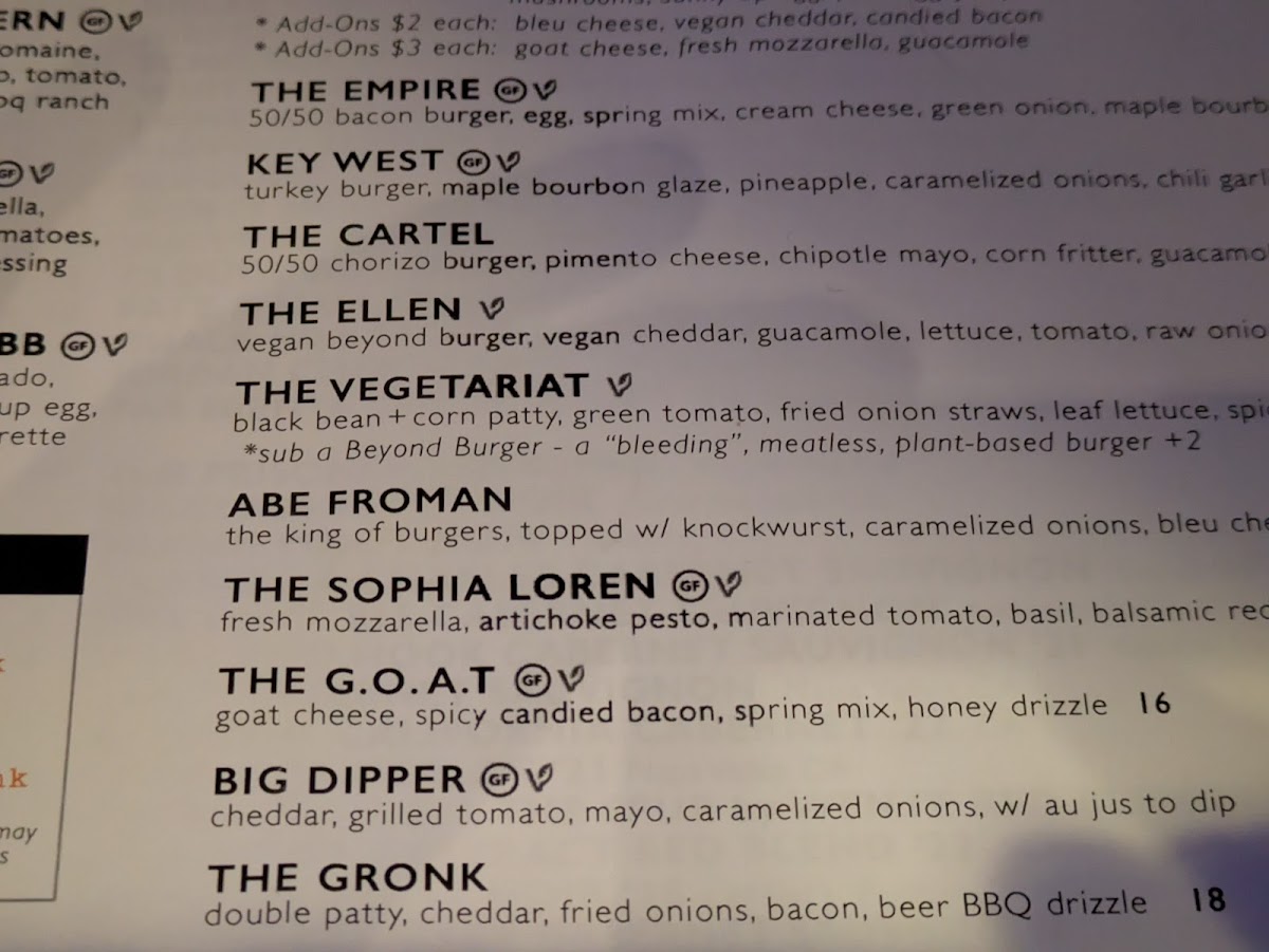 goat cheese, spicy candied bacon, spring mix, honey drizzle, pretzel bun